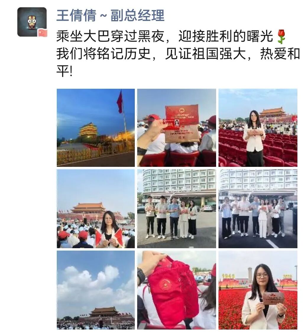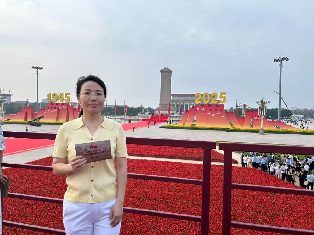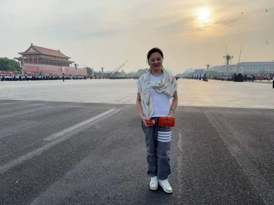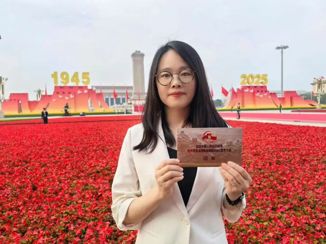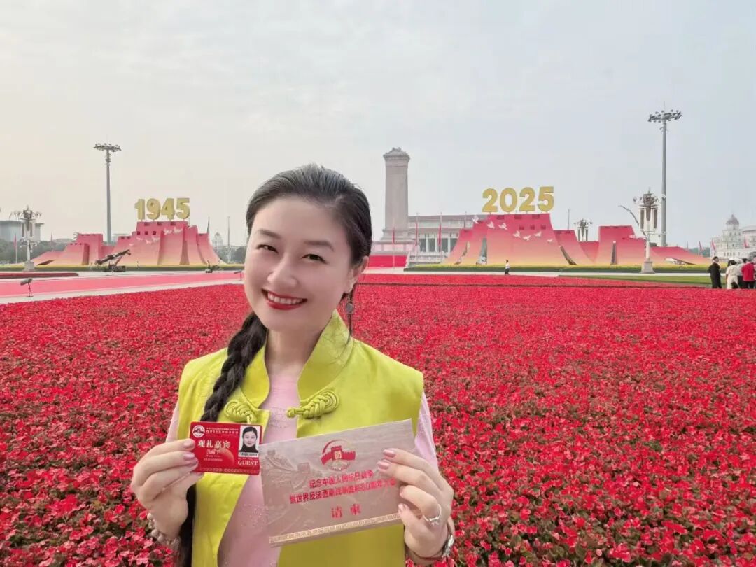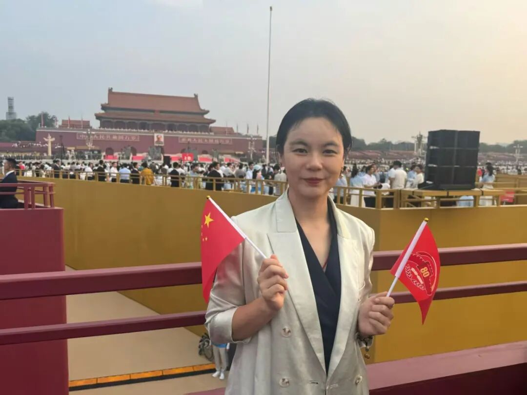 李琛:从凌晨一点半的集合,到日出时分踏上天安门广场的土地,从黑夜到白天的路程,就是连接起抗战胜利的曙光!眼前是五彩鲜花的海洋,是红旗飘飘的世界。太阳悬停在英雄纪念碑旁,仿佛带着无穷的能量照进无数不屈的灵魂。当礼炮声声传来,心脏被瞬间击中,现场的聆听带着强烈的冲击,肃穆中不由想起战火纷飞的惊心动魄,激起强烈的共鸣。当军乐队开始演奏,当全场开始大合唱,没有比这一刻更让我真正感受与祖国同在。属于这片土地的力量与底气,是战士们昂然的步伐挺拔的脊梁,是装备驶过的轰鸣与天空的翱翔,是身边陌生人不约而同挺直的肩膀,是大家眼里共同闪烁的光。是无数人用生命奋斗写就的历史,是此刻与这片土地紧紧相连的力量。当我满怀激动与自豪站在观礼台上,看阅兵方阵如川流奔涌,那是历史长河里沉淀的民族魂魄,更是时代苍穹下升腾的文明气象。这份荣光是无数先辈以血与汗为基,也是当下每一个你我以奋斗为梁。是把日子过扎实、把事情做妥当,是为这山河壮阔续笔,为民族复兴创造,让中华的精神脉络,在代代相传里生生不息,永续荣光!