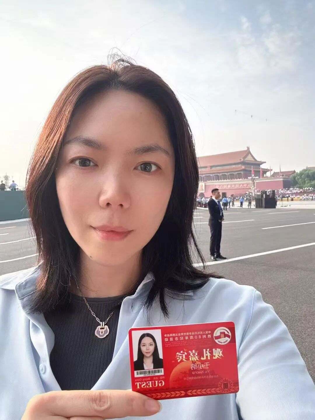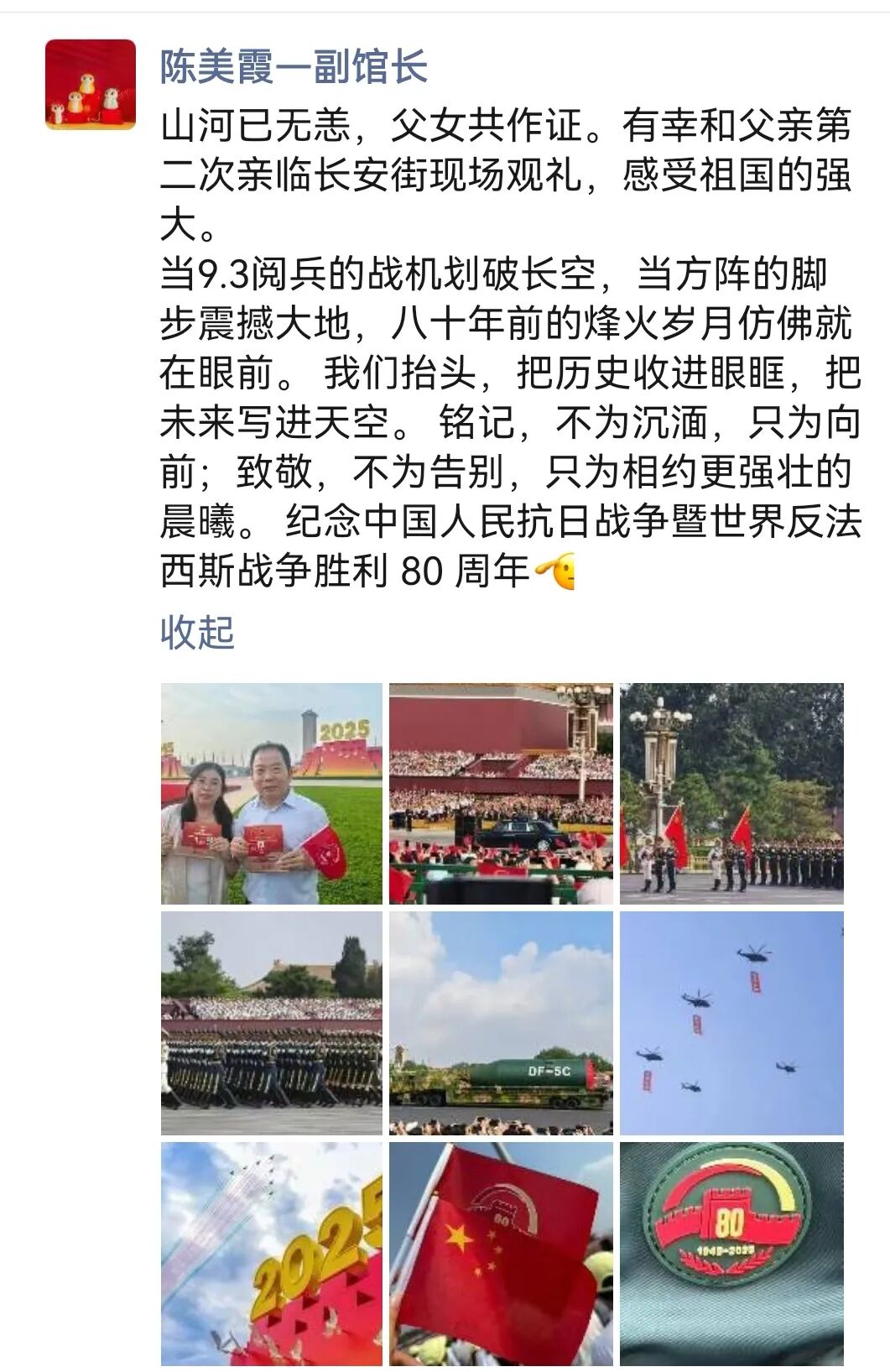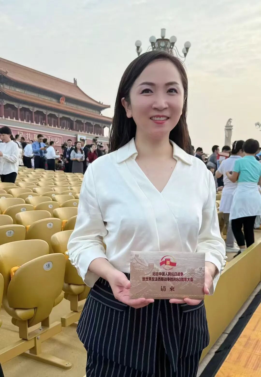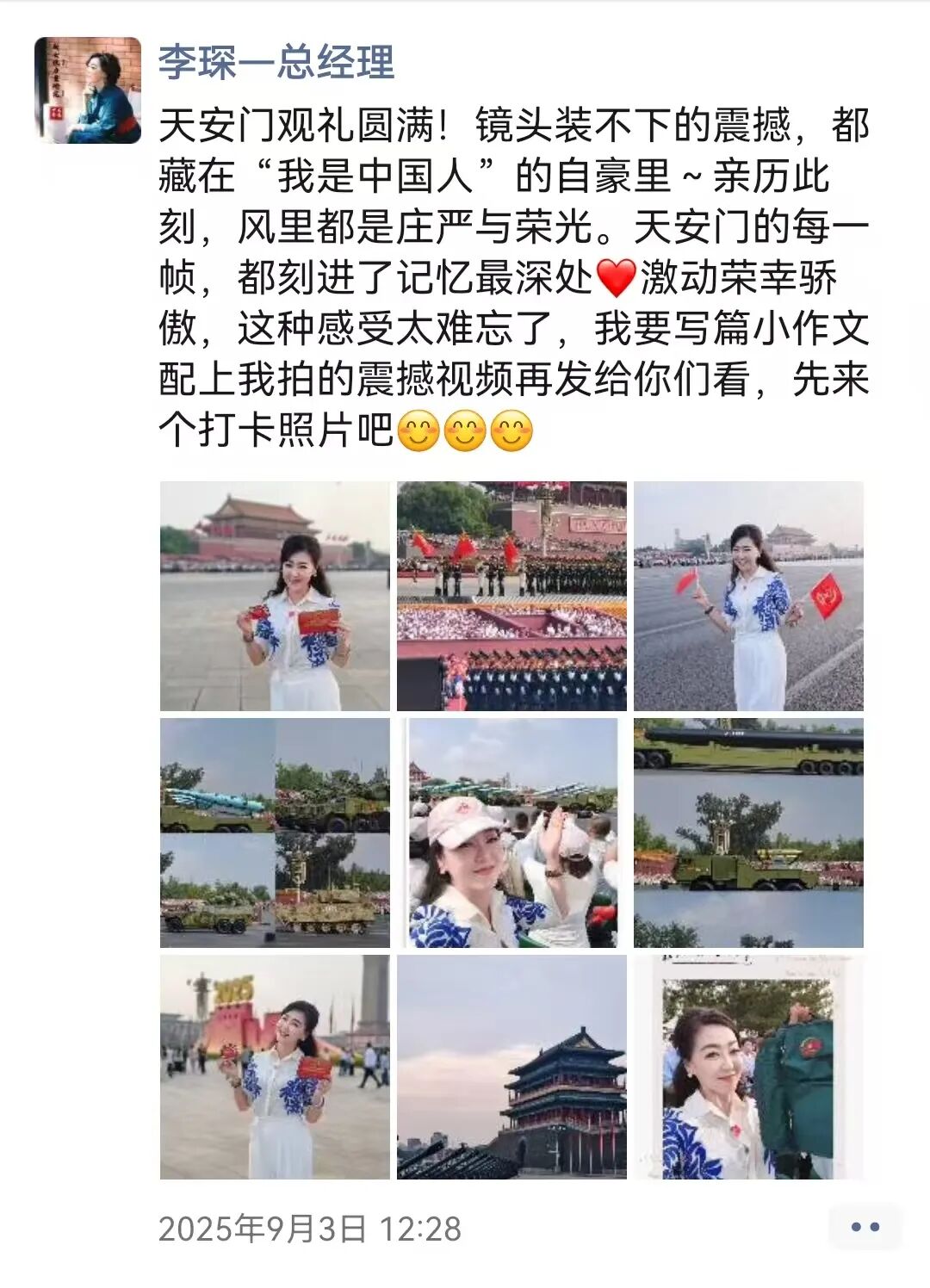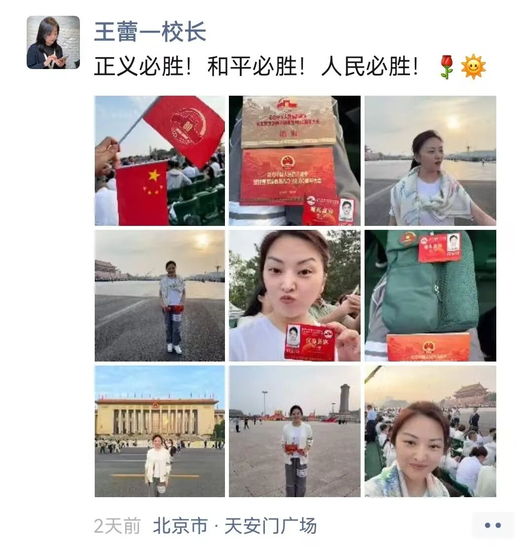 李琛:从凌晨一点半的集合,到日出时分踏上天安门广场的土地,从黑夜到白天的路程,就是连接起抗战胜利的曙光!眼前是五彩鲜花的海洋,是红旗飘飘的世界。太阳悬停在英雄纪念碑旁,仿佛带着无穷的能量照进无数不屈的灵魂。当礼炮声声传来,心脏被瞬间击中,现场的聆听带着强烈的冲击,肃穆中不由想起战火纷飞的惊心动魄,激起强烈的共鸣。当军乐队开始演奏,当全场开始大合唱,没有比这一刻更让我真正感受与祖国同在。属于这片土地的力量与底气,是战士们昂然的步伐挺拔的脊梁,是装备驶过的轰鸣与天空的翱翔,是身边陌生人不约而同挺直的肩膀,是大家眼里共同闪烁的光。是无数人用生命奋斗写就的历史,是此刻与这片土地紧紧相连的力量。当我满怀激动与自豪站在观礼台上,看阅兵方阵如川流奔涌,那是历史长河里沉淀的民族魂魄,更是时代苍穹下升腾的文明气象。这份荣光是无数先辈以血与汗为基,也是当下每一个你我以奋斗为梁。是把日子过扎实、把事情做妥当,是为这山河壮阔续笔,为民族复兴创造,让中华的精神脉络,在代代相传里生生不息,永续荣光!
