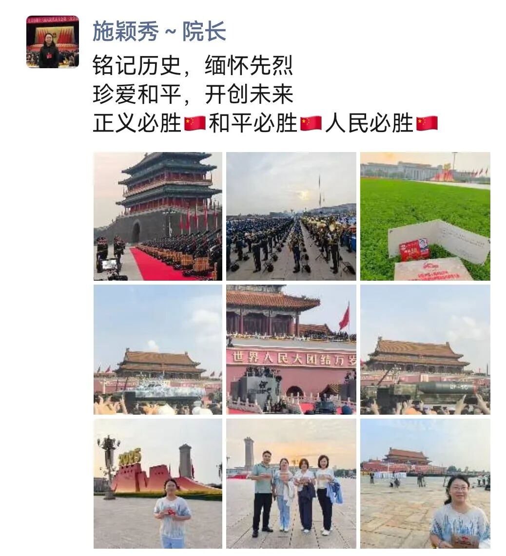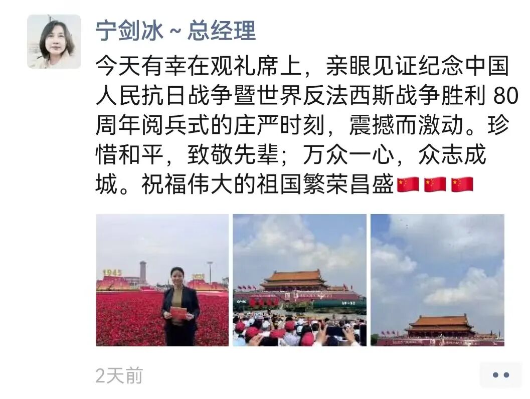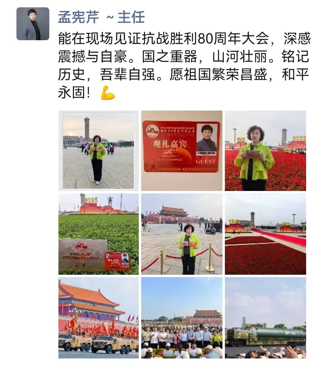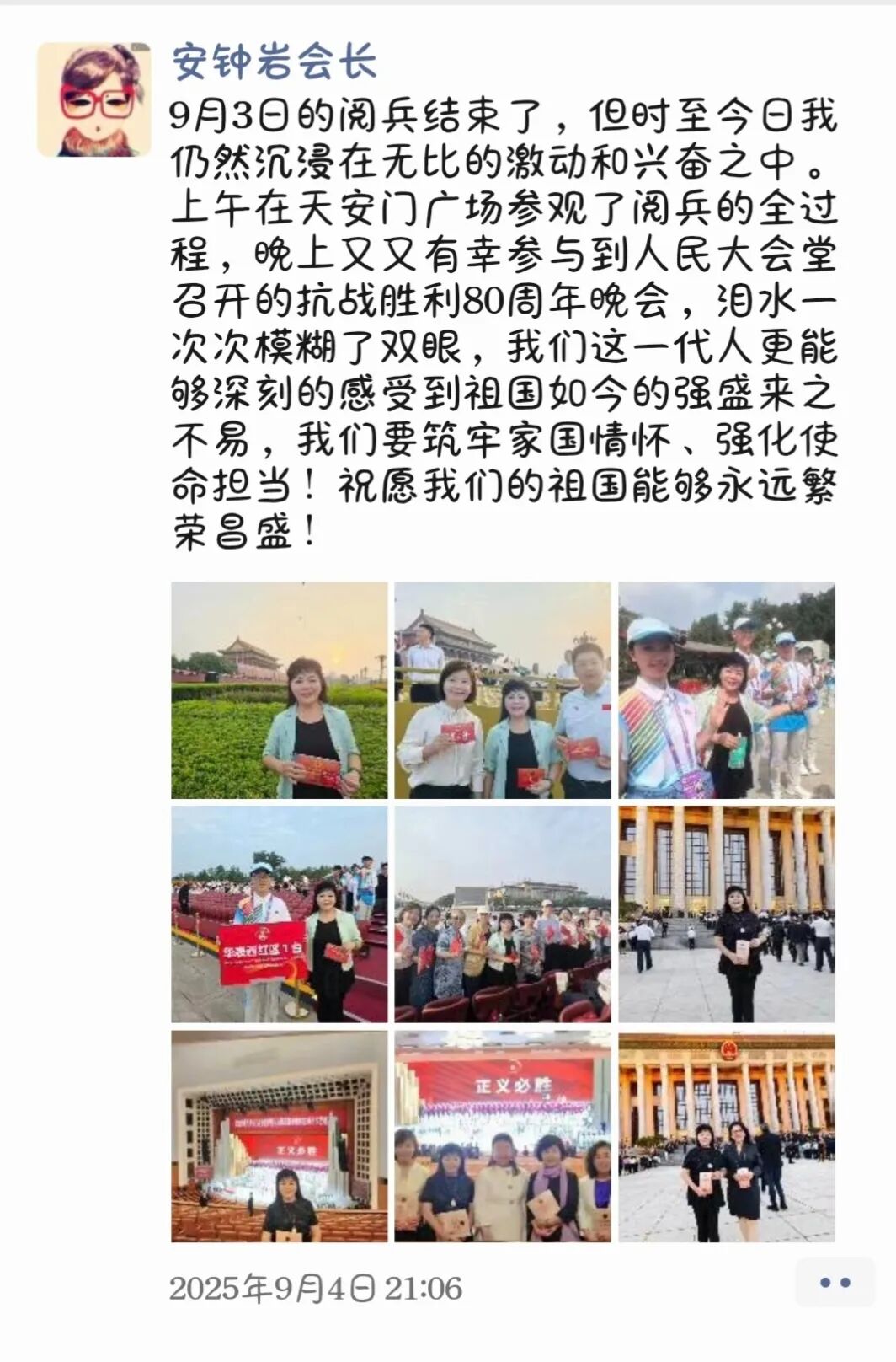 “9月3日的阅兵结束了,但时至今日我仍然沉浸在无比的激动和兴奋之中。上午在天安门广场参观了阅兵的全过程,晚上又又有幸参与到人民大会堂召开的抗战胜利80周年晚会,泪水一次次模糊了双眼,我们这一代人更能够深刻的感受到祖国如今的强盛来之不易,我们要筑牢家国情怀、强化使命担当!祝愿我们的祖国能够永远繁荣昌盛!”——来自安钟岩会长的“新”声。