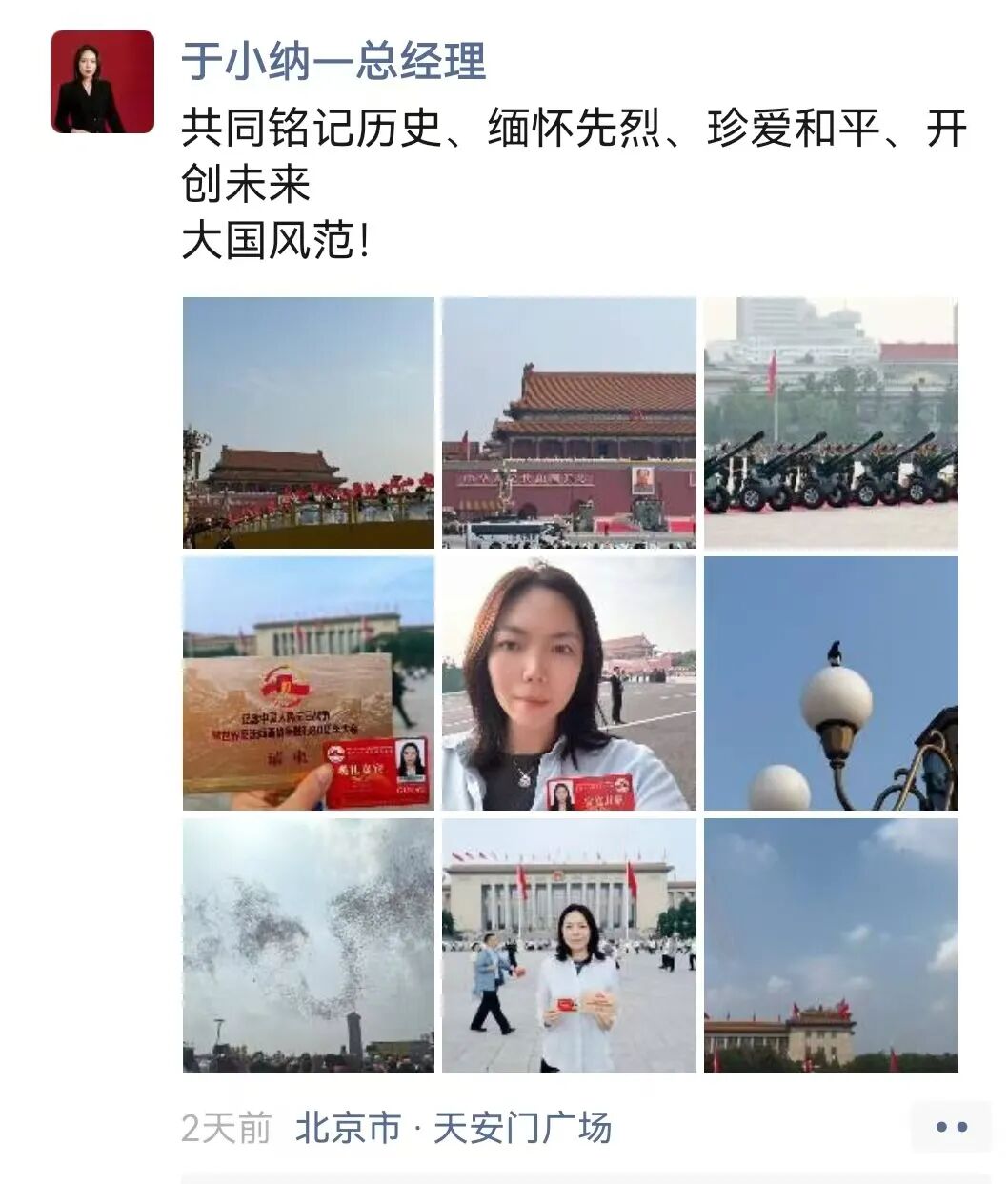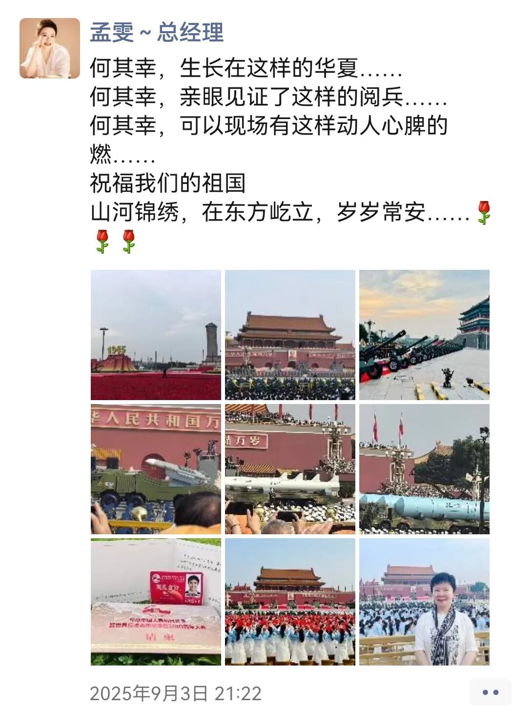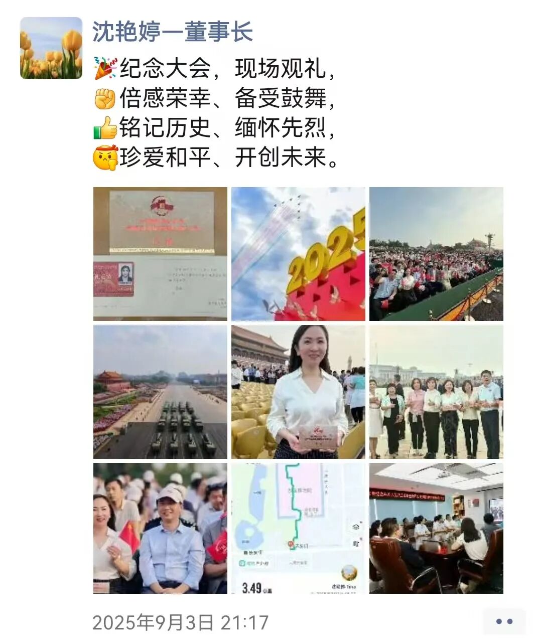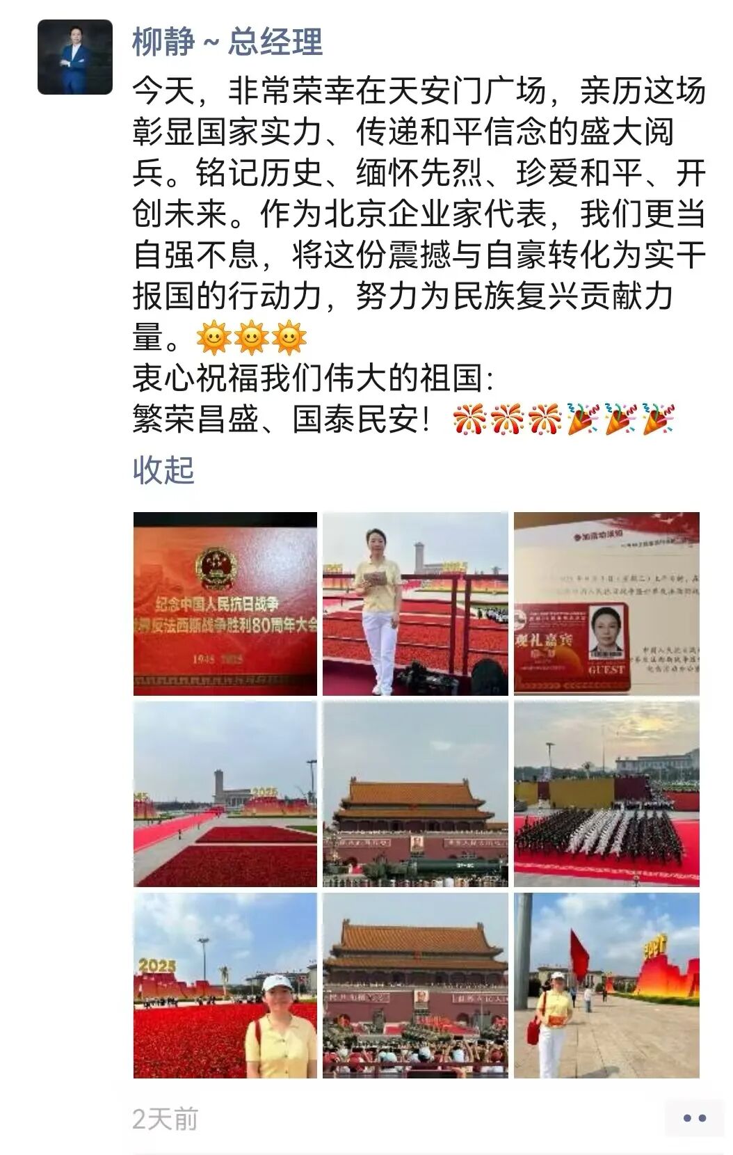 “9月3日的阅兵结束了,但时至今日我仍然沉浸在无比的激动和兴奋之中。上午在天安门广场参观了阅兵的全过程,晚上又又有幸参与到人民大会堂召开的抗战胜利80周年晚会,泪水一次次模糊了双眼,我们这一代人更能够深刻的感受到祖国如今的强盛来之不易,我们要筑牢家国情怀、强化使命担当!祝愿我们的祖国能够永远繁荣昌盛!”——来自安钟岩会长的“新”声。